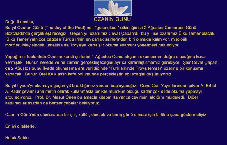 BOZCAADA'DA ŞİİR ŞÖLENİ Gün Doğarken yapılacak İliada okumasına dünyanın çeşitli ülkelerinden şiirseverler katılıyor. Günün konuşmacıları arasında Manfred Korfman, Cevat Çapan, Feridun Andaç ve Haluk Şahin de var. Bozcaada, Ağustos ayının ilk iki günü yine dünya şiir cumhuriyetinin başkenti olacak. Bu yıl ikincisi yapılacak olan Ozanın Günü’nde Bozcaada’nın serin rüzgarında Homeros’un, Ülkü Tamer’in ve başka şairlerin mısraları uçuşacak... Ozanın Günü etkinlikleri 1 Ağustos günü yılın ozanı olarak adaya davet edilen Ülkü Tamer’in akşam saatlerinde şiirlerini okumasıyla başlayacak. Şiirlerinde mitolojik temalara sık sık yer veren Tamer’in, çeşitli dönemlerinden örnekler okuması bekleniyor. 2 Ağustos sabahı güne geçen yıl olduğu gibi yine Homeros’un Troya’da geçen büyük destanı İliada’nın okunuşu ile başlanacak. Güneş Anadolu’nun tepeleri arkasında belirdiğinde açış okumasını Ülkü Tamer yapacak. Tamer’in ardından Troya’yı kazan arkeolog Manfred Korfman, geçen yılın ozanı Cevat Çapan ve dünyanın çeşitli ülkelerinden gelen edebiyatseverler istedikleri dilde okuyuşa katılabilecekler. Geçen yıl yedi dilde yapılan okumanın bu yıl 10 dile ulaşacağı sanılıyor. Bu etkinlik için buluşma yeri yine Kale arkasında Kaikias Oteli’nin önündeki kumsal. Buluşma saati, sabah 6:00. Üç saatlik ilk okuma seansından sonra kahvaltı arası verilecek. Daha sonra Şair Cevat Çapan Şiirimizde Troya teması, edebiyat eleştirmeni Feridun Andaç ise Türkçe’de Homeros ve Troya ve yazar Haluk Şahin Homeros’u niçin okuyoruz? konulu konuşmalar yapacaklar. Öğleden sonraki İliada okuma seansı ise saat 18:00’de başlayıp günbatımına kadar sürecek. Son okumayı da yılın ozanı Ülkü Tamer yapacak. Daha sonra, Belgin Şahin ve Nilgün Sokullu’nun hazırladıkları Troya Hazinesi takıları defilesine geçilecek. Takıların yerel mankenlerce sunulması olaya başka bir renk katıyor. Yılın ozanı her yıl olduğu gibi bu yıl da Kaikias otelindeki özel Şairin Odasında misafir edilecek. Talay Şarap firması 2. Ozan’ın günü onuruna özel etiketli bir anı şarabı çıkartıyor. Kabarnet ve merlot üzümlerinden yapılan ve numaralı şişelerde sınırlı sayıda satışa çıkartılacak olan bu şarap Homeros adını taşıyor.